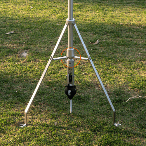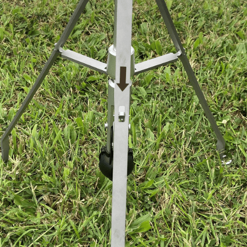 Open tripod legs by pulling on any one of the three legs and push the leg support bracket down to hold the tripod in place.