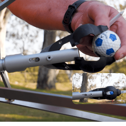 Open the spring-loaded ball cage with your hands and insert the golf ball and tee into the cage.