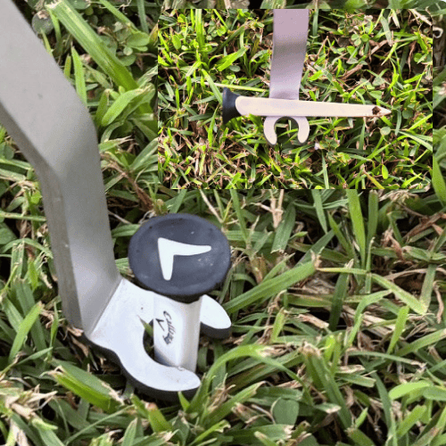 Place T-UP Assist on the tee box with the arrow on the tripod leg facing the direction you are aiming to hit the ball down the fairway.