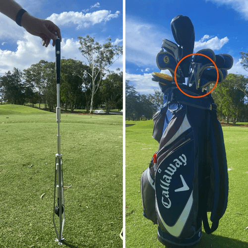 Place T-UP Assist upside down into your bag, with the handle placed in the bag first and the legs of T UP Assist visible at the top of the golf bag.